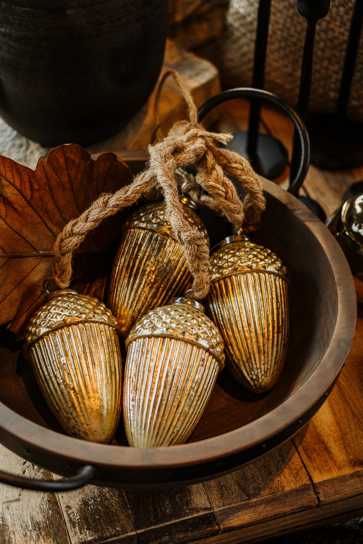 Handmade from antique-finished glass, the Acorn Cluster adds a touch of old-world charm to cold weather styling. Strung together with natural jute, each glass acorn catches the light with subtle shimmer. Hang it from a wreath, layer it on a mantle, or style it in a decorative bowl — a versatile accent that brings warmth and texture from fall through until Christmas.