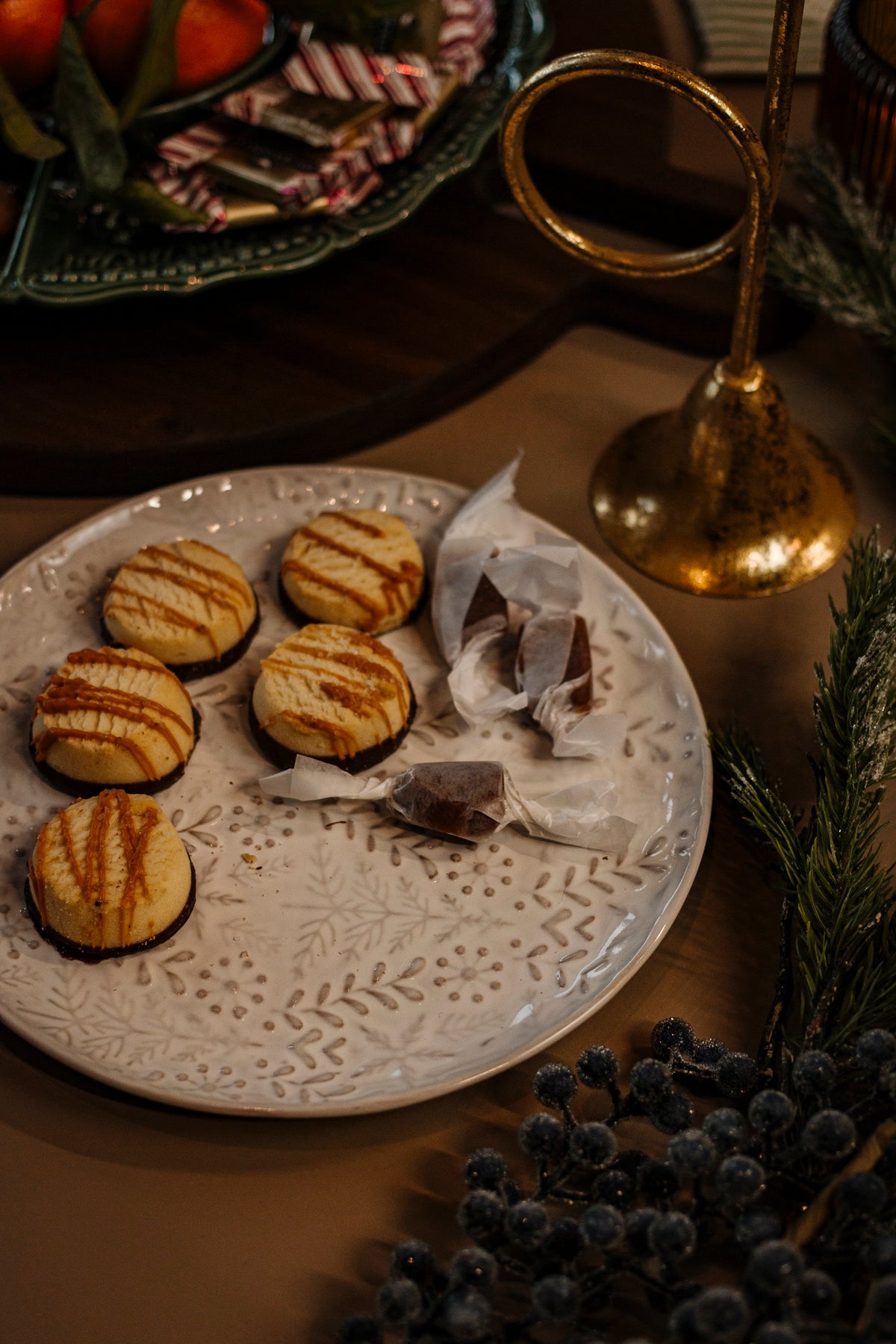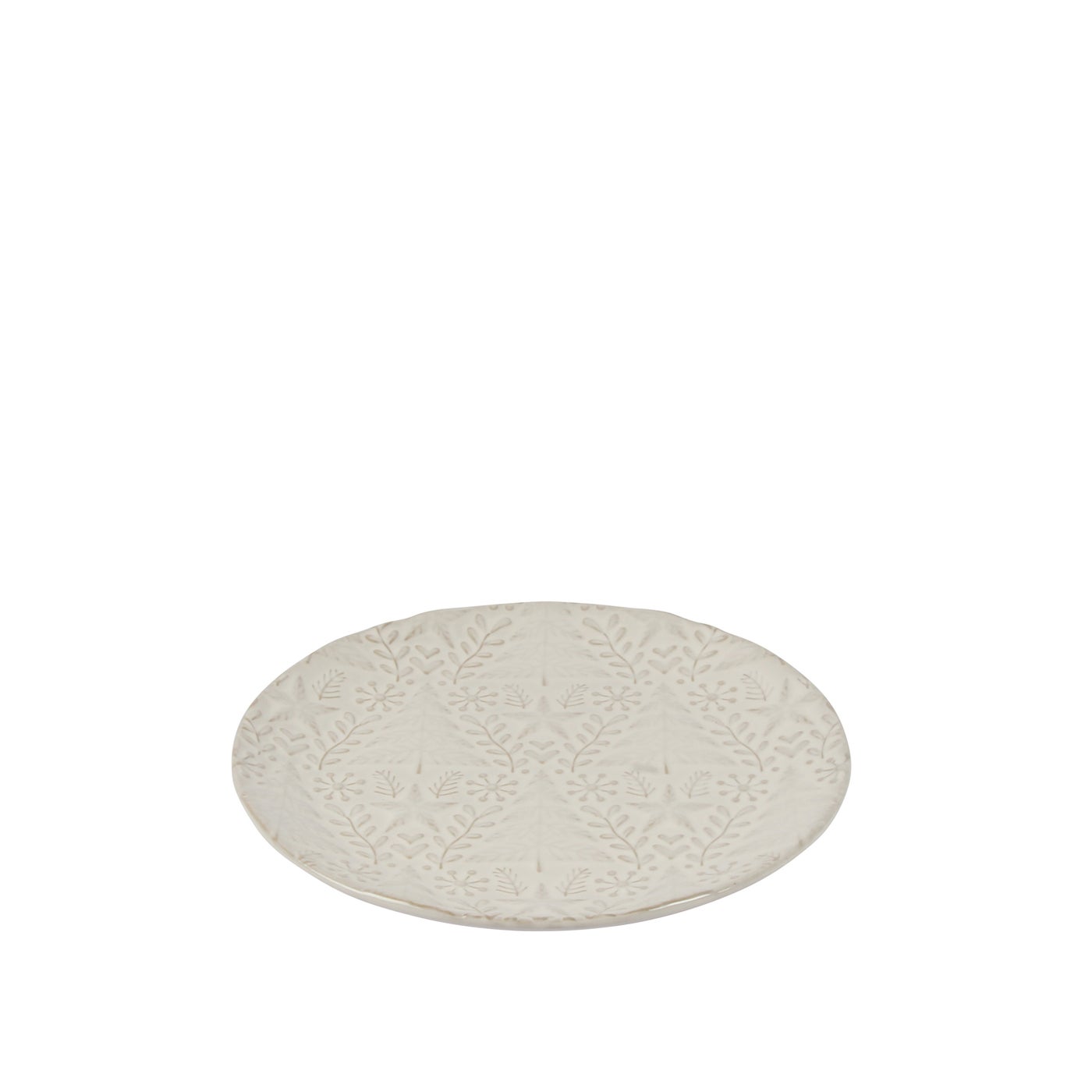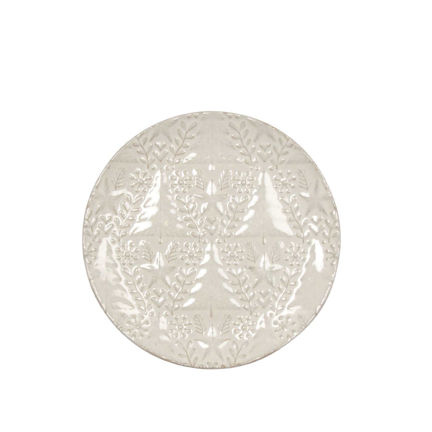 A smaller server with embossed snowflakes and branches, designed for breads, cheeses, or sweets. Its size makes it an easy addition to holiday gatherings, offering both function and understated seasonal beauty.
