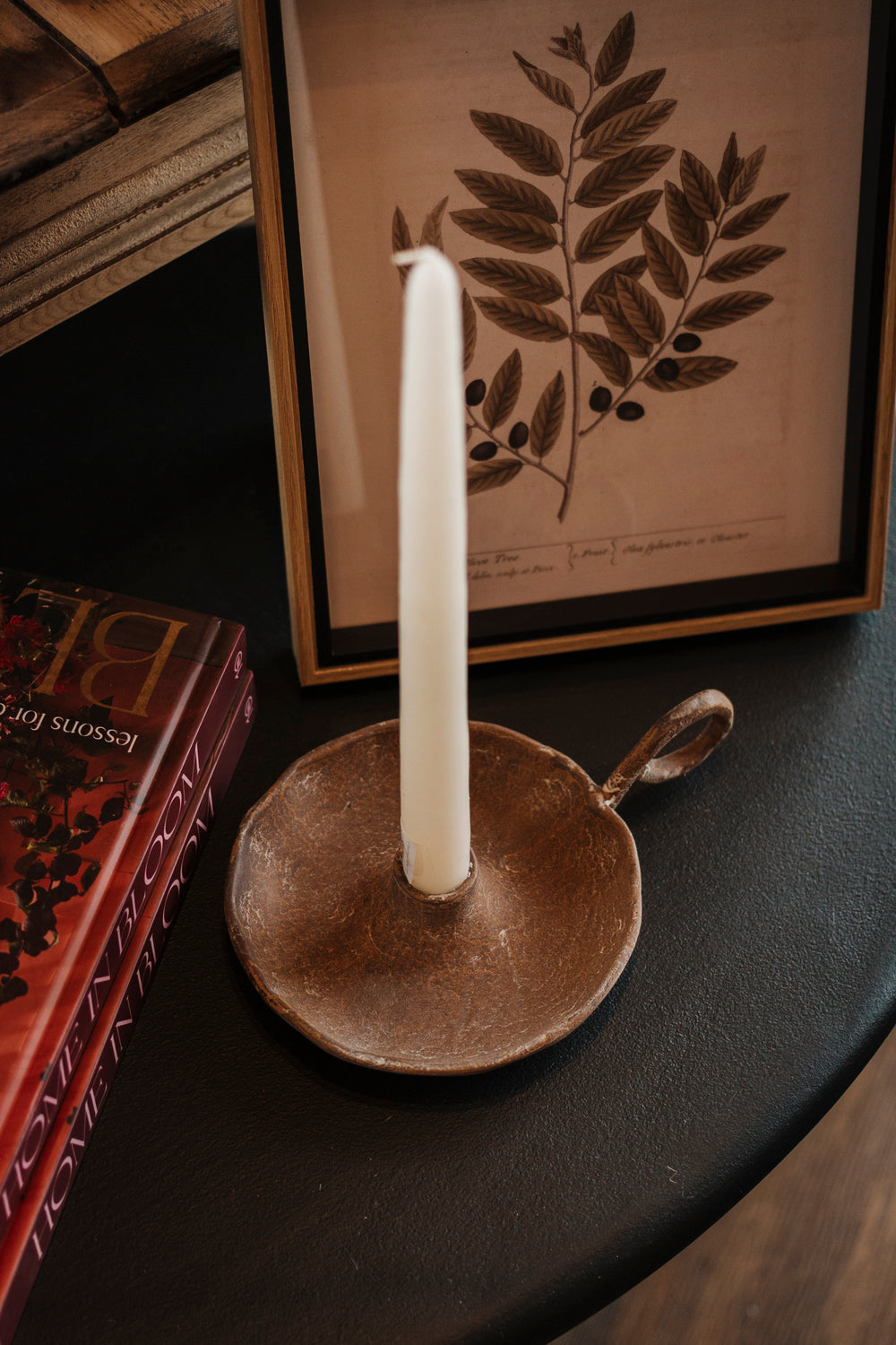 A nod to old-world charm, this sand-cast metal holder features a rich, raw umber finish and a looped handle that feels both functional and timeless. Its petite, sturdy shape brings a soft, nostalgic glow to any corner—whether on a bedside table, mantel, or tucked into a layered table display. Thoughtful and quietly striking, it’s a piece that feels right at home.