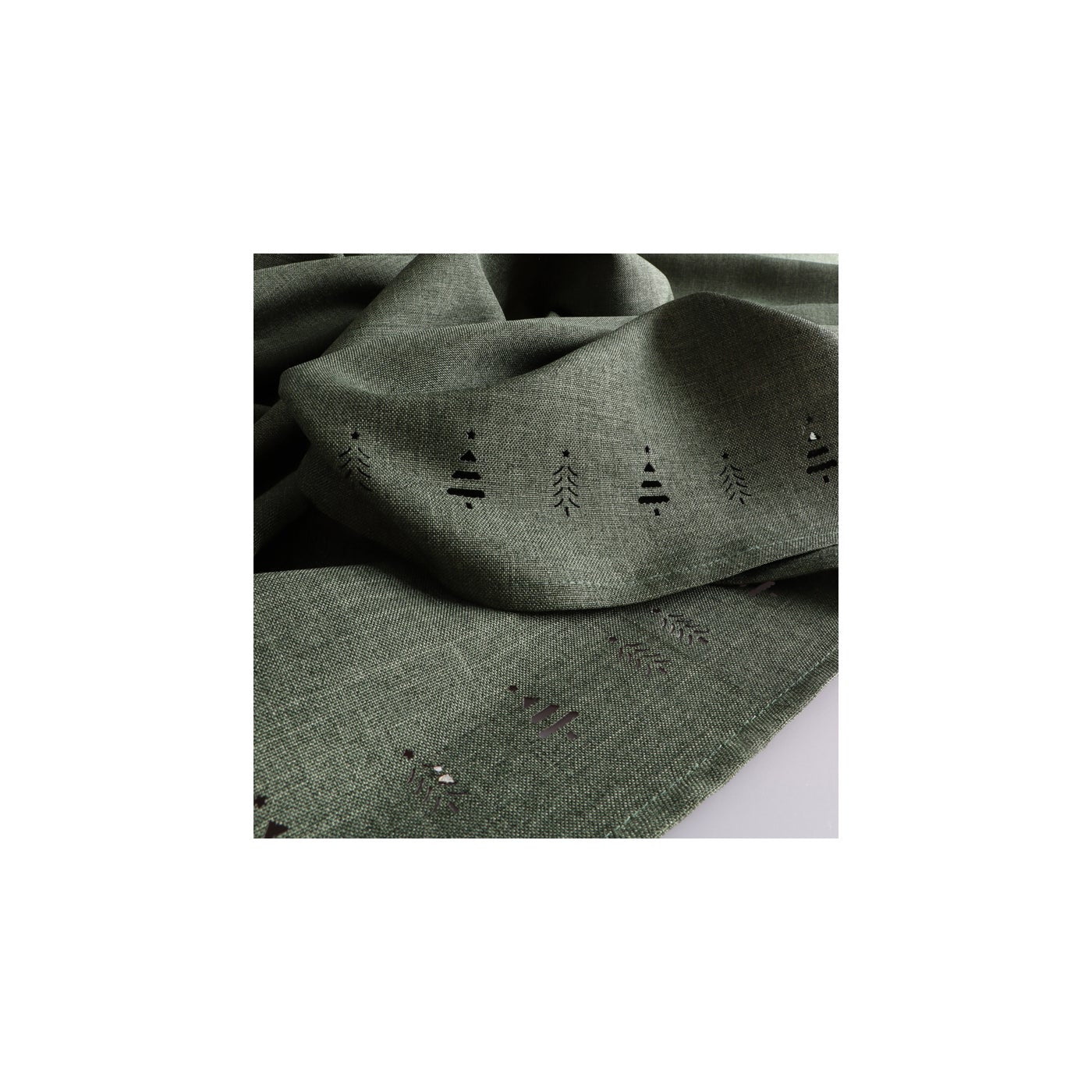 Laser-cut tree motifs line the edges of this deep forest tablecloth, bringing a quiet elegance to gatherings large and small. Its linen-like drape is both practical and refined, easy to care for yet elevated enough to anchor a holiday table. Pair it with simple stoneware and natural accents for a look that feels timeless.