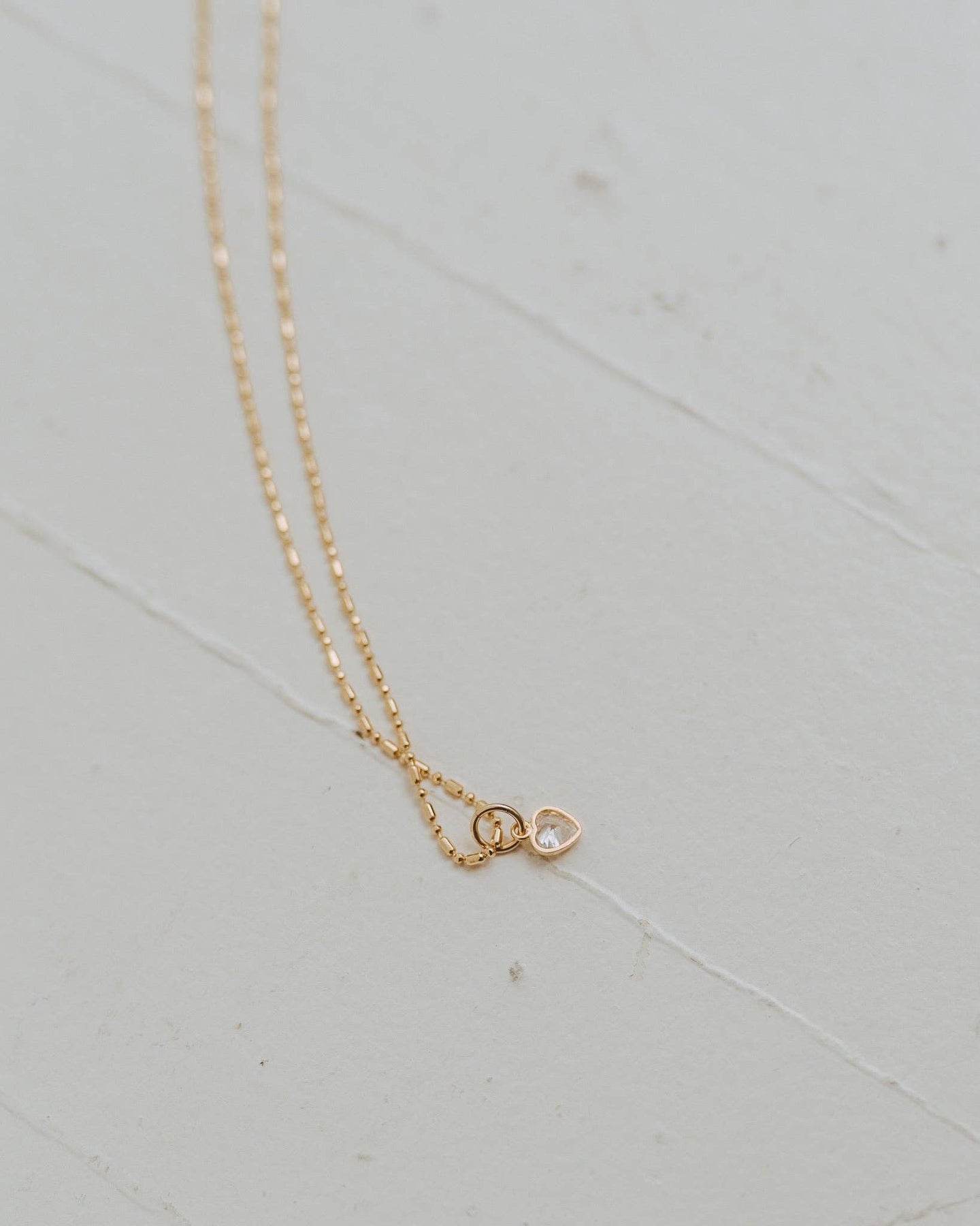 This dainty heart pendant sparkles softly with a tiny cubic zirconia, floating along an 18k gold-filled ball bar chain. Subtle and sentimental, it’s a gentle nod to love in all its forms.