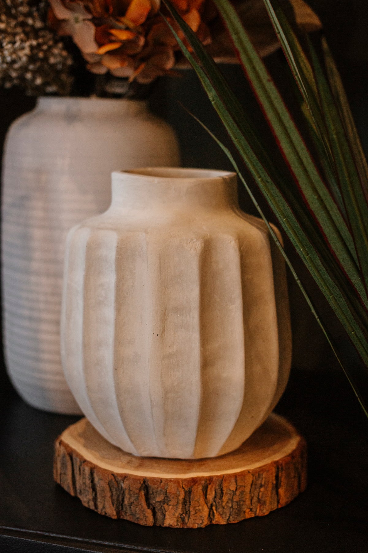 A sculptural paper mache vase with a soft ribbed shape and warm, matte finish. It brings quiet texture and fullness to a shelf, table, or entryway without feeling heavy.