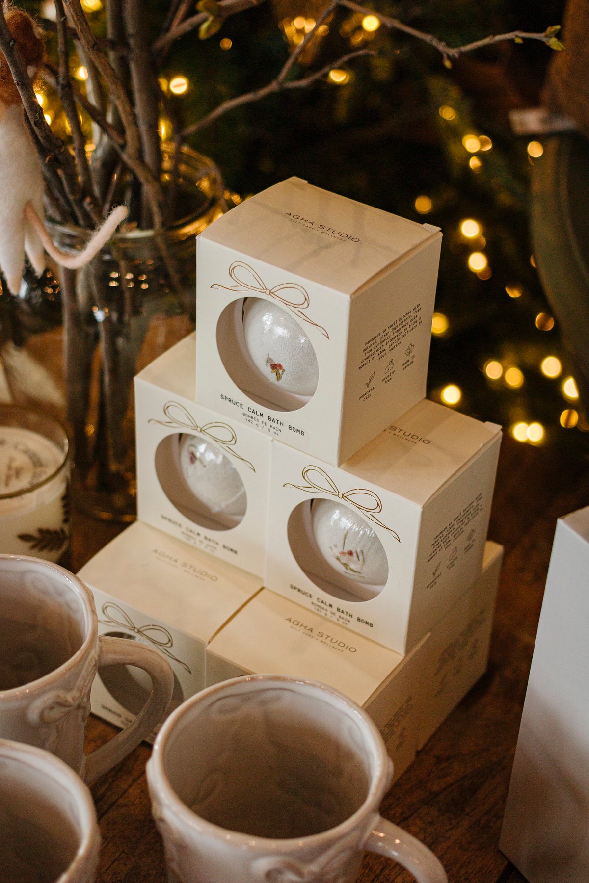 Agha Studio’s Spruce Calm Bath Bomb blends fir needle, pine, and cedarwood for a grounding, woodsy aroma that feels like stepping into winter stillness. As the bomb slowly dissolves, green clay softens the water and rice bran oil gently hydrates the skin. The experience is simple, calming, and deeply restorative—perfect for unwinding at the end of the day.
