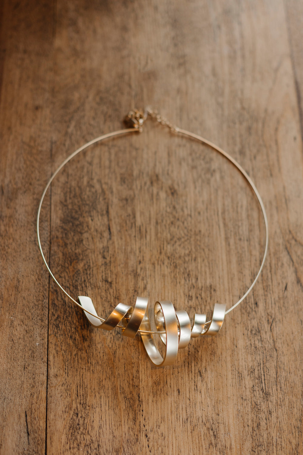 Sculptural, modern, and just the right amount of bold—the Voss Necklace is a statement piece that plays with movement, space, and form. A striking spiral pendant is suspended from a delicate yet structured wire cuff, creating a floating effect that feels both effortless and intentional. Despite its architectural design, it remains lightweight and comfortable, making it an artful addition to everyday styling or elevated looks.