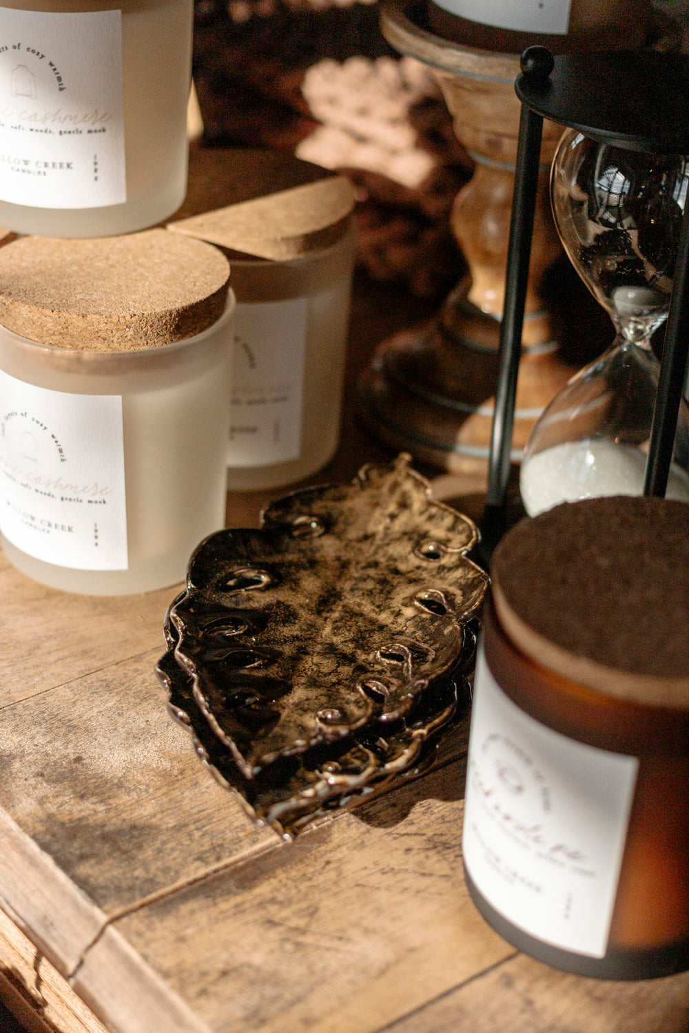 Bring a touch of nature to your home with this small stoneware leaf dish. Perfect as a catchall, soap dish, or small accent piece. Each dish has a unique reactive glaze, adding a rustic charm to your decor.