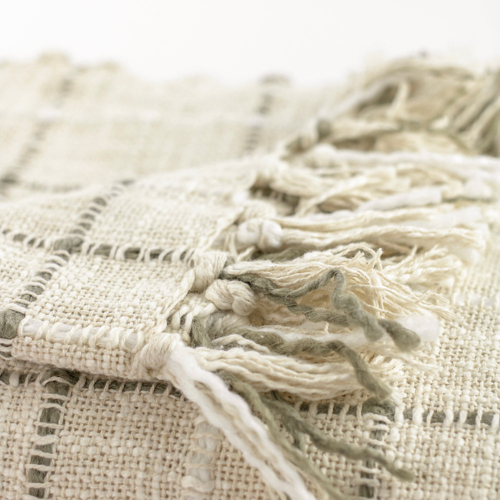 Woven from 100% cotton with a soft, textured feel, this fringed throw adds quiet character wherever it lands. The neutral base is accented by a mossy green check — subtle, simple, and easy to style. Use it as a lightweight throw, a relaxed table covering, or even a summer picnic layer.