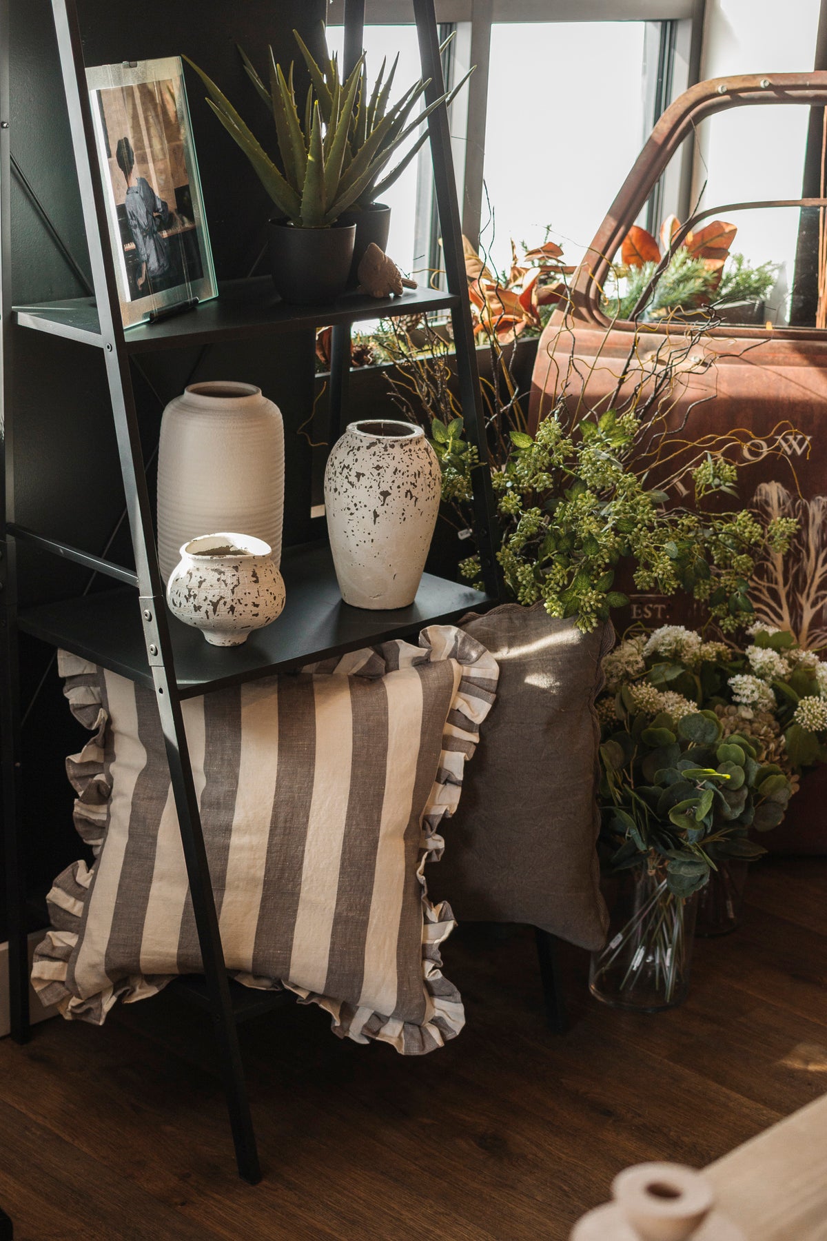 Wide neutral stripes and soft ruffled edges give this pillow a relaxed French cottage charm. The gentle ruffle trim adds movement and texture while the classic stripe keeps the overall look timeless.