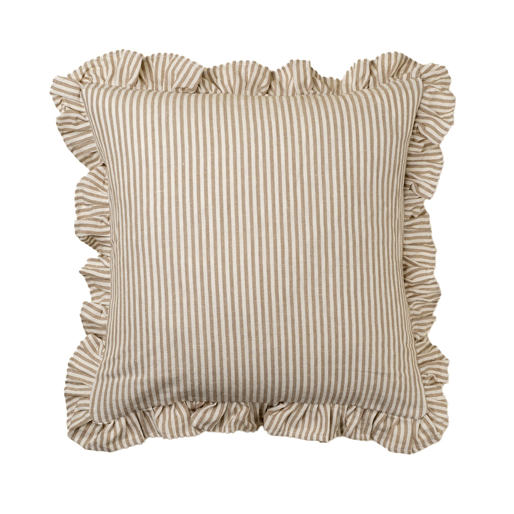 Soft beige thin stripes and a delicate ruffled edge give this pillow a quiet, gathered charm. The pattern is subtle and easy, adding gentle texture while keeping the palette calm and versatile.